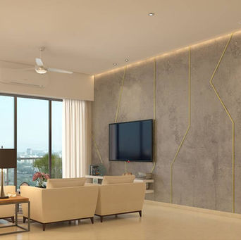 The entire house is designed based on minimum furniture where we have proposed no storage below bed, Wardrobe with mirror or glass shutters, cantilevered drawers and sleek storages. Living one big wall played with concrete texture and golden finished stripes inserted in between.